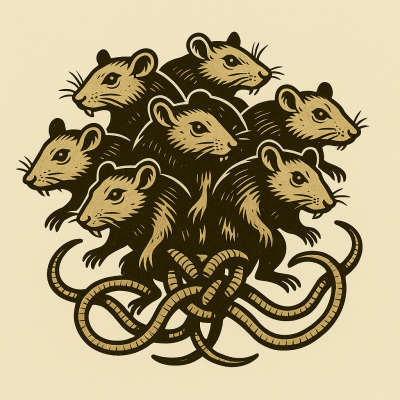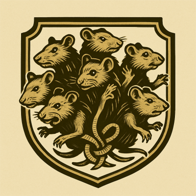 For this one we started with a question asking ‘Do you know what a rat king is?’ followed up with ‘Can you make me a modern/vintage mascot logo of a rat king based on your description above? No text needed on the logo.’. The initial results were pleasing and we just asked for a few revisions. We weren’t keen on the rats all having the same exact face – easy enough, just asked for the faces to vary. You’ll also notice in the prompt history link (as well as the gallery) the one version is pretty poor as it has random hands growing out of tails to go along with the mottle/smudged image generation).