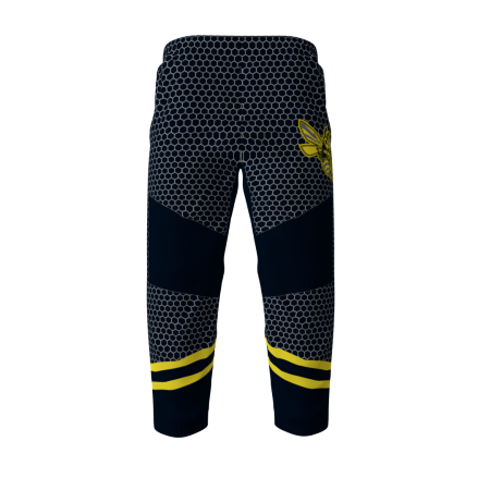 Killers Bees custom roller hockey pants. These pants look amazing paired with the Killer Bees jerseys! Fully vector. Reinforced knees. Drawstring waist. Numbers on the pants are optional at no additional cost.