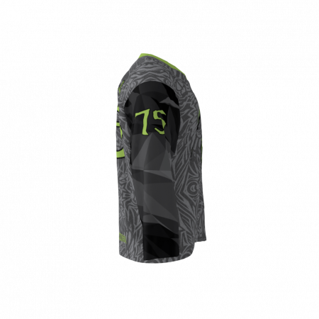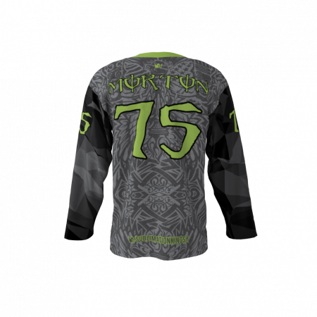 The Rage custom hockey jerseys are an interesting specimen, If left unchecked rage may lead to violence. One must kindle the fire inside and tame the rage with these jerseys. The sleeves have a shattered glass design filled with shades of dark gray and black. The front and back have a gray and dark gray indigenous pattern throughout. Fluorescent-like lime green and kelly green fill out the numbers/names and front claw marks. Front claw marks? Yes the rage within will be clawing through the front of these as you tear up the rink.